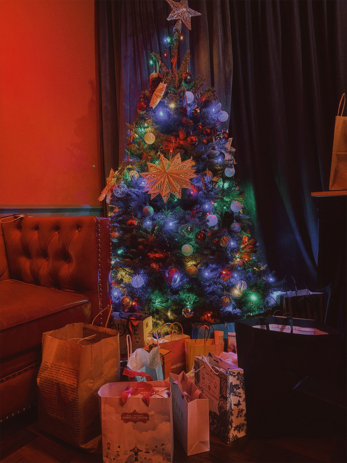 This year, I decided to do the same. I went down to a nursery with Domina Delilah and brought ourselves a noble fir home. One December evening, we gathered with our loved ones, stringing fairy lights and hanging ornaments, cozying up with mugs of mulled wine. In the nights that followed, I found myself lounging by the tree with friends and after sessions with subs — sometimes with a glass of wine, over Tchaikovsky’s Nutcracker humming in the background, though I’d prefer Christmas Eve/Sarajevo by Trans-Siberian Orchestra. We chatted about the year that had passed, our happiest moments, what had been lost, what had endured, and what, quietly, had been enough.